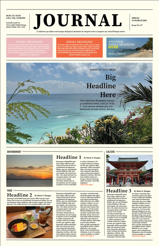 One of the tasks was to find an easy beginner-friendly Adobe InDesign-tutorial on YouTube to try out, and I chose to do a newspaper-template, and it turned out like this: